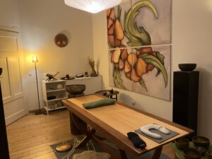 In bequemer Kleidung warm und wohl gebettet, bietet die Klangliege ein besonders genussreiches Erlebnis. Den Klang erzeuge ich mit den Händen durch Streichen der Saiten an der Unterseite der Liege. Umhüllt und durchströmt von Schwingung ist die Erfahrung kaum vergleichbar mit bereits Bekanntem. In Kombination mit weiteren Quellen des Raumklangs im Vor- und Nachspann öffnet sich oft ein Weg nach innen – an den Ort an dem du in dir ruhst.
